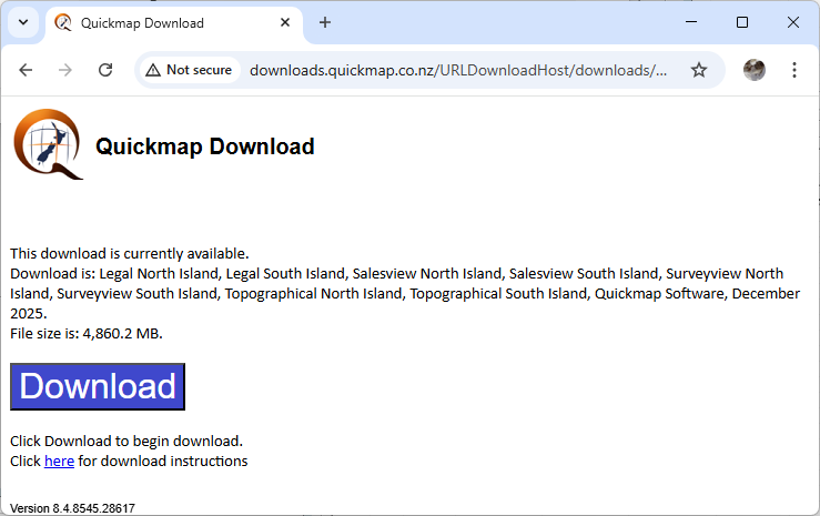 After clicking on the download link provided by Custom Software Limited, or pasting the URL into your web browser, a webpage similar to the screenshot below will be displayed. This screen will show what you are going to download and the size of the download.